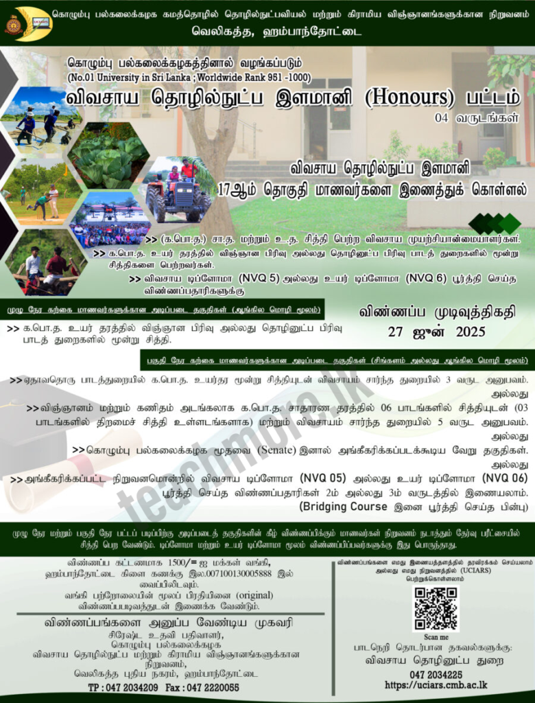 University of Colombo Opens Admissions for Bachelor of Agro-Technology (Honours) Program