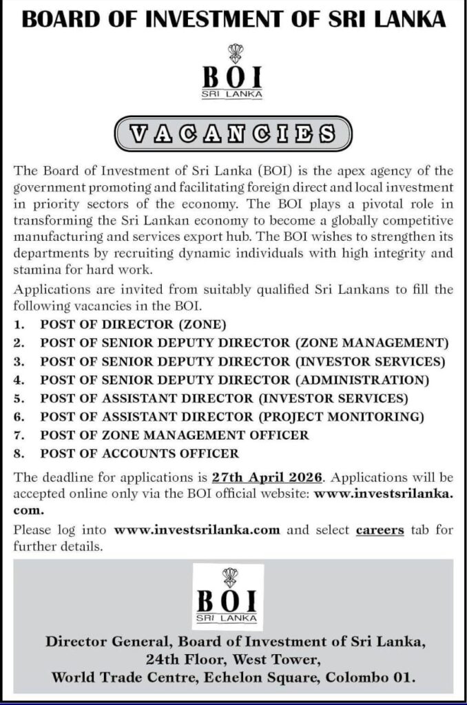 The BOI, which plays a key role in promoting foreign and local investment in Sri Lanka, is seeking experienced and motivated individuals to strengthen its operations across several departments.