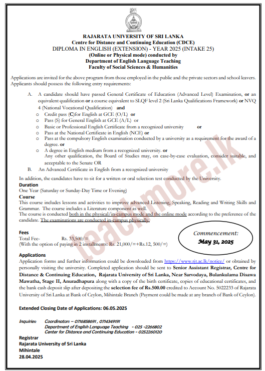 Rajarata University Opens Applications for Diploma in English (Intake 25)