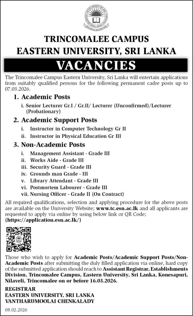 The Trincomalee Campus of the Eastern University, Sri Lanka, has officially announced several job openings for permanent cadre positions across various departments. This recruitment drive covers Academic, Academic Support, and Non-Academic roles, offering a range of opportunities for qualified professionals.