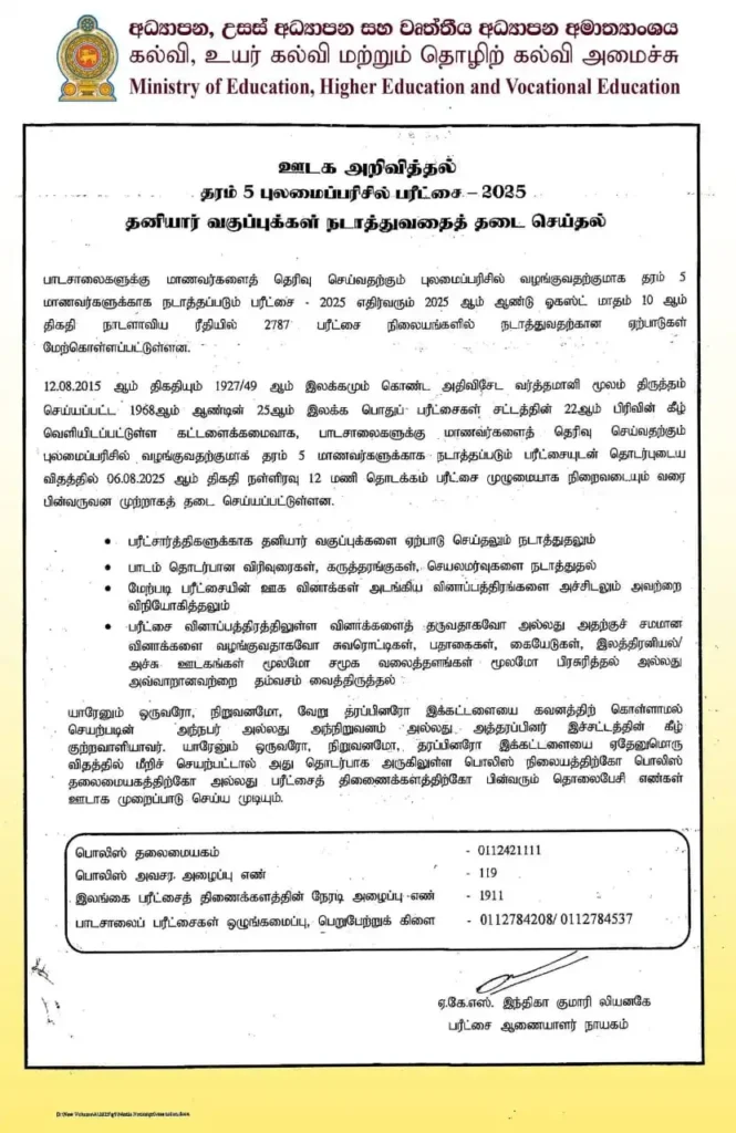 Grade 5 Scholarship Exam 2025 – Strict Prohibition on Coaching Classes