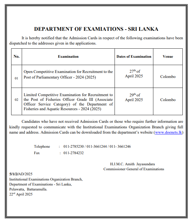 • Admission Cards – SLPS Grade III Examination 2025 (2026): Available for Download