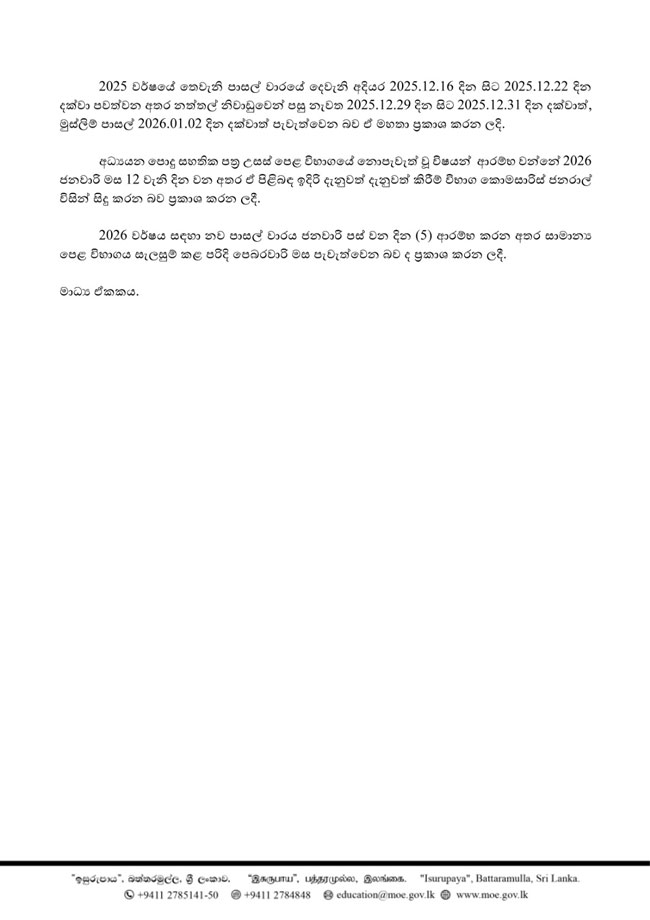 - G.C.E. Advanced Level (A/L) Exam: The commencement of the G.C.E. A/L Examination (for the 2026 batch) and other future examinations are provisionally scheduled to begin on Saturday, December 12, 2026.
