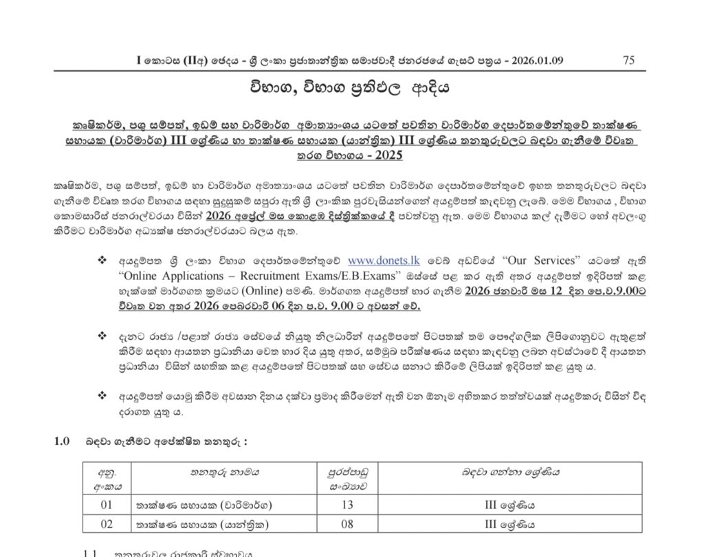 According to the government gazette dated January 9, 2026, applications are now invited from qualified Sri Lankan citizens for the following posts: