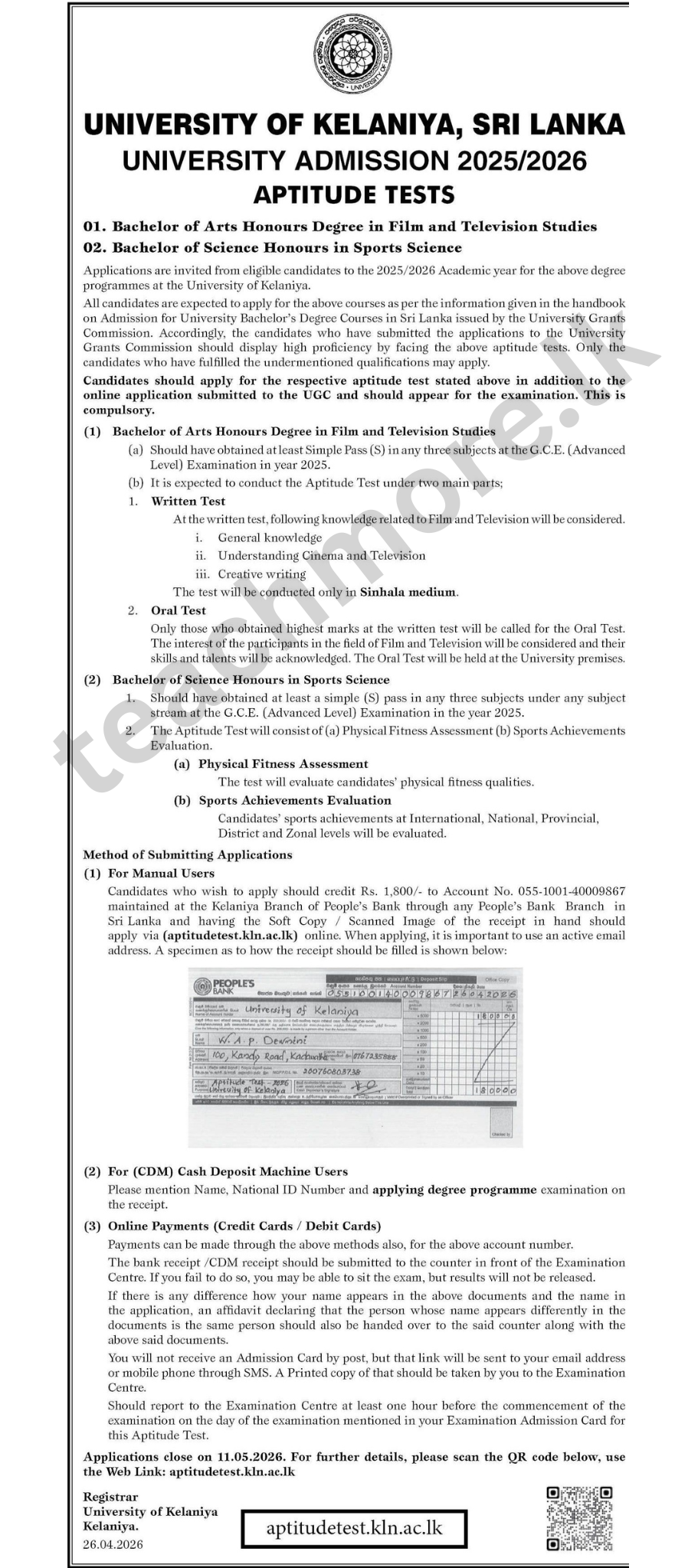 University of Kelaniya Aptitude Test 2025/2026