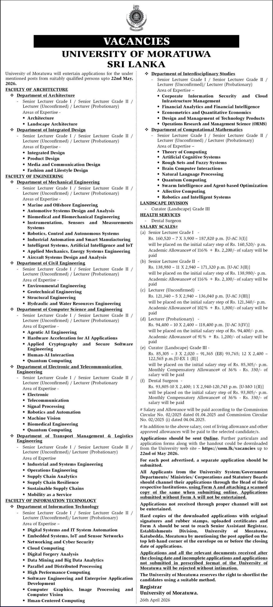 The University of Moratuwa has announced vacancies for several academic positions, inviting applications from qualified candidates for the year 2026.